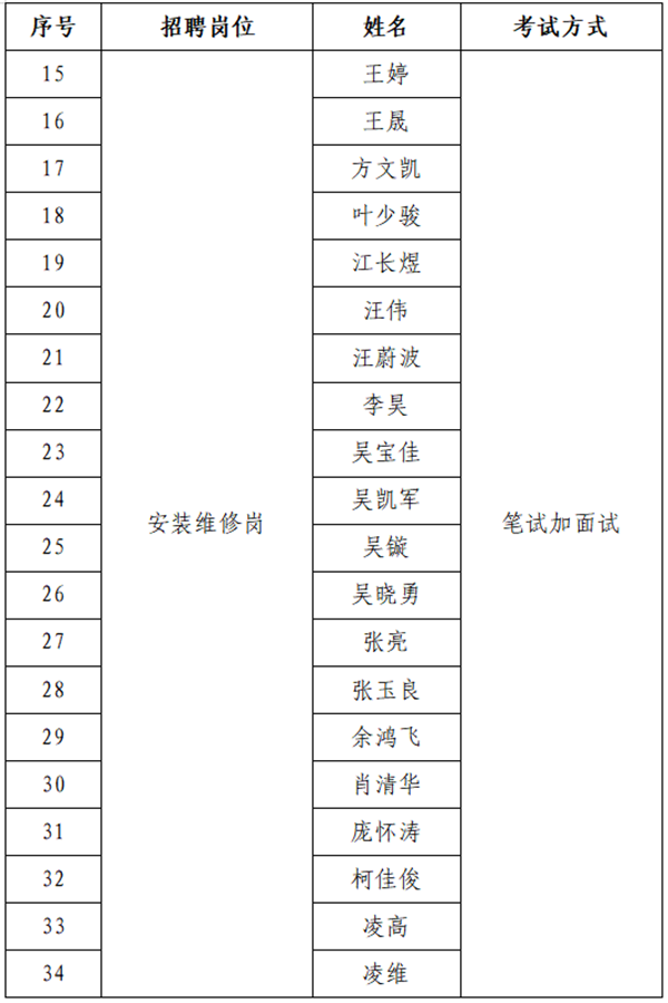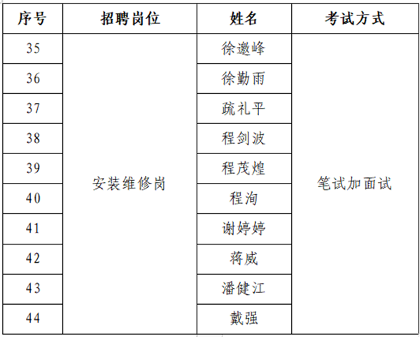 (三)根據(jù)招聘崗位數(shù),在同崗位中依筆試成績從高分到低分,安裝維修崗按面試人數(shù)與招聘崗位數(shù)5:1的比例進行確定,勘探設(shè)計崗按面試人數(shù)與招聘崗位數(shù)3:1的比例進行確定,若達(dá)不到開考比例,則取消本次的招聘計劃。最后一名如有多名考生筆試成績相同的,一并確定為面試人員。