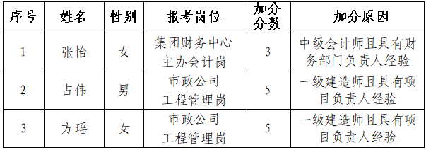 根據(jù)《黃山市徽城投資集團(tuán)有限公司招聘公告》(2020年7月23日)規(guī)定,“對(duì)報(bào)名參加主辦會(huì)計(jì)崗位的考生如持有中級(jí)會(huì)計(jì)師及以上證書(shū)且具有財(cái)務(wù)部門(mén)負(fù)責(zé)人經(jīng)驗(yàn)的(任職企業(yè)的注冊(cè)資本需為1千萬(wàn)元及以上),給予總成績(jī)3分的加分。對(duì)報(bào)名參加工程管理崗位的考生如持有一級(jí)建造師證書(shū),給予總成績(jī)2分的加分;如持有一級(jí)建造師證書(shū)且具有項(xiàng)目部負(fù)責(zé)人經(jīng)驗(yàn)的(任職企業(yè)的注冊(cè)資本需為1千萬(wàn)元及以上),給予總成績(jī)5分的加分”。現(xiàn)對(duì)報(bào)考人員申請(qǐng)加分的審核工作已全部結(jié)束,經(jīng)審核符合加分條件的人員共3人,現(xiàn)予以公示,接受社會(huì)監(jiān)督。