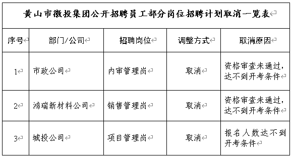 黃山市徽城投資集團有限公司公開招聘員工的報名和資格初審工作現(xiàn)已全部結束,根據(jù)公司《招聘公告》要求,此次招聘因部分崗位不具備開考條件,經(jīng)研究決定予以取消。具體崗位招聘計劃取消情況如下:
