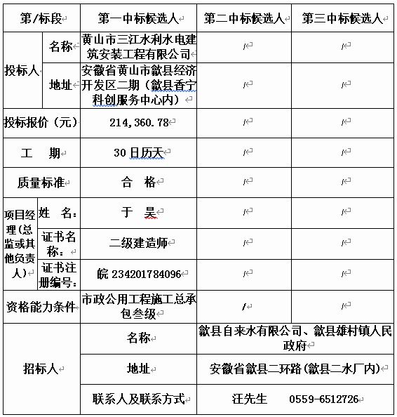 安徽華偉工程咨詢有限公司受歙縣自來水有限公司、歙縣雄村鎮(zhèn)人民政府的委托,對(HJSGC2020HWS001、歙縣雄村鎮(zhèn)雄村山斗組農(nóng)飲水附屬土建工程)進(jìn)行(小型項目招標(biāo)),本項目于(2020年3月02日)在(歙縣自來水有限公司三樓會議室)開標(biāo)、評標(biāo),現(xiàn)根據(jù)有關(guān)法律、法規(guī)要求,對中標(biāo)候選人進(jìn)行公示。